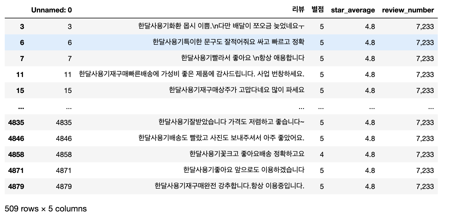 # 리뷰에서 '한달사용기' 단어를 포함하지 않는 행만 추출