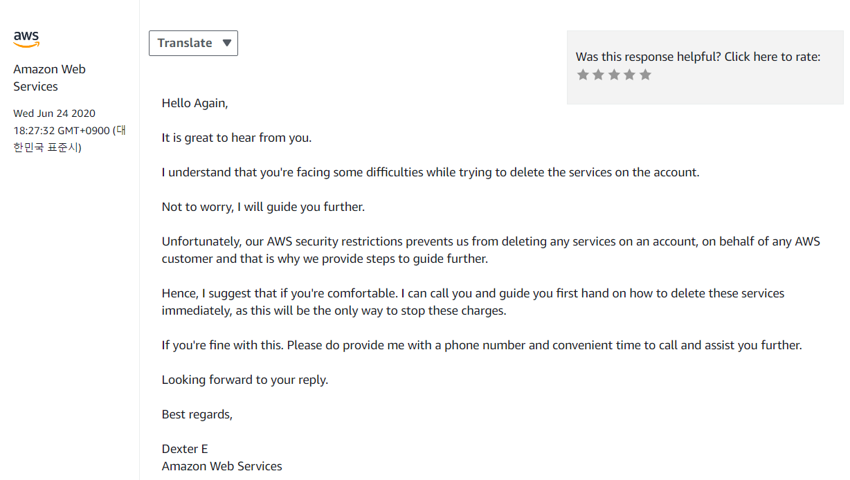 그런데 이 과정에 생각보다 쉽지 않았습니다. 그래서 AWS 고객지원센터에 문의 글을 올려놓았더니 통화로 서비스 종료하는 방법을 도와준다고 하네요.