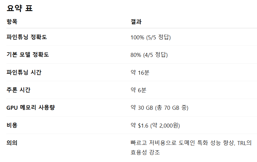 짧은 시간과 낮은 비용으로도 파인튜닝만으로 기본 모델 대비 성능이 크게 향상됨을 확인할 수 있었습니다. 정답률이 80%에서 100%로 올라간 점이 그 증거입니다. - 빠르고 경제적인 실험 가능