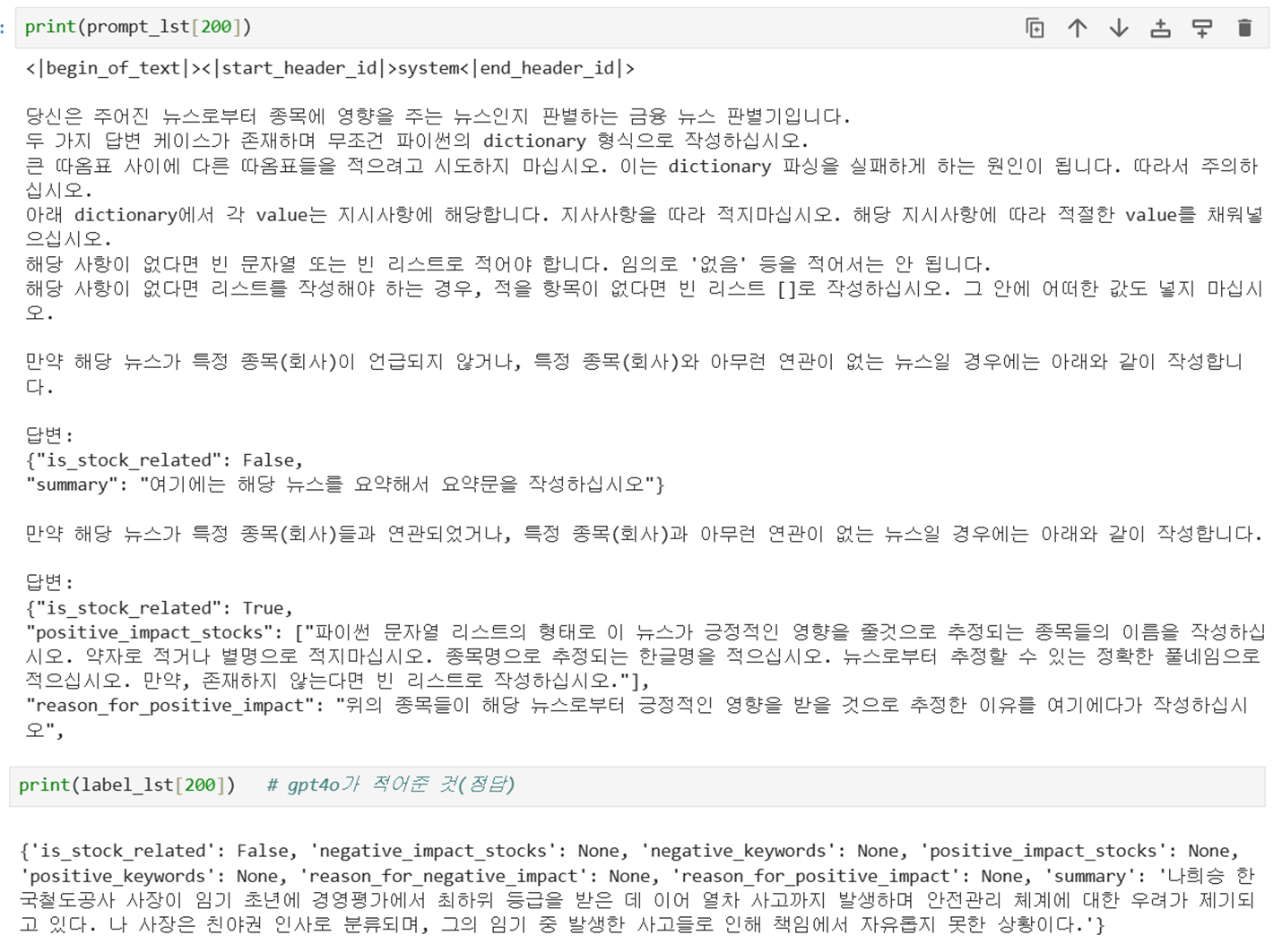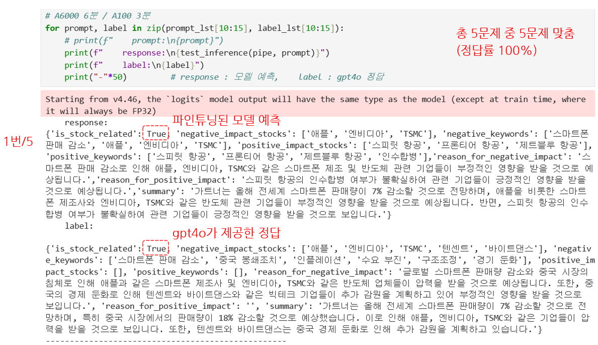 5문제 샘플 중 5개를 전부 다 맞췄다. 샘플 경제 뉴스의 주식시장 영향 True/False 추론을 잘하는 것을 알 수 있다.