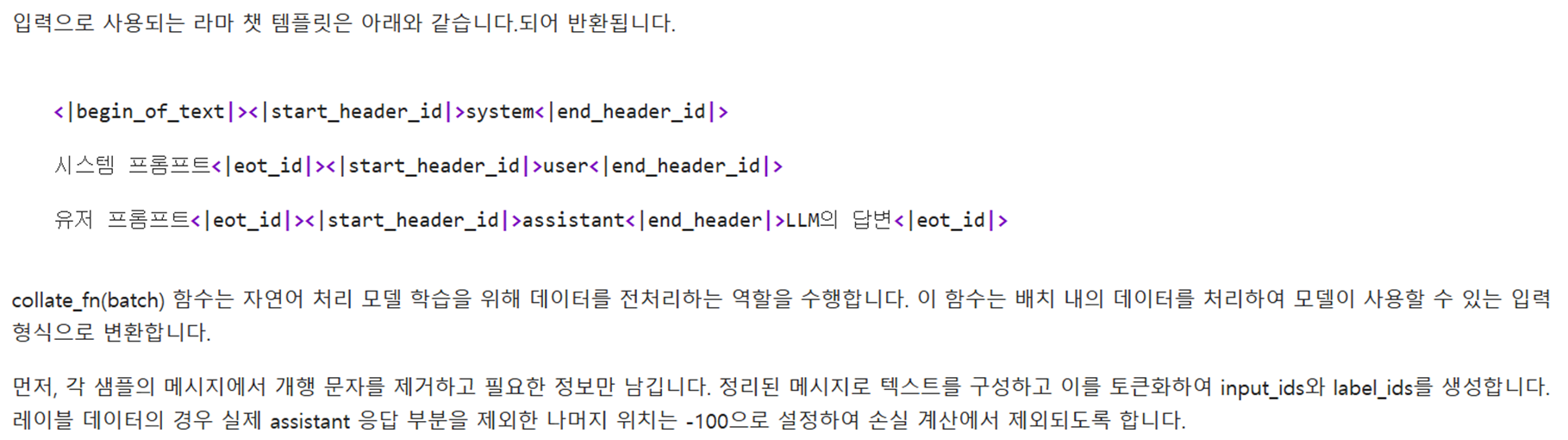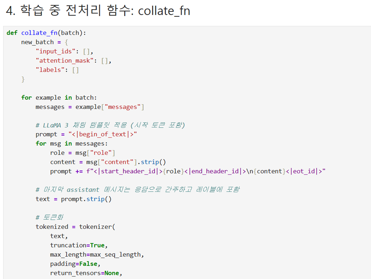 @ 파인튜닝 준비 ; LoRA와 SFTConfig 설정 -> 학습 중 전처리 함수 collate_fn -> 데이터 정수 인코딩