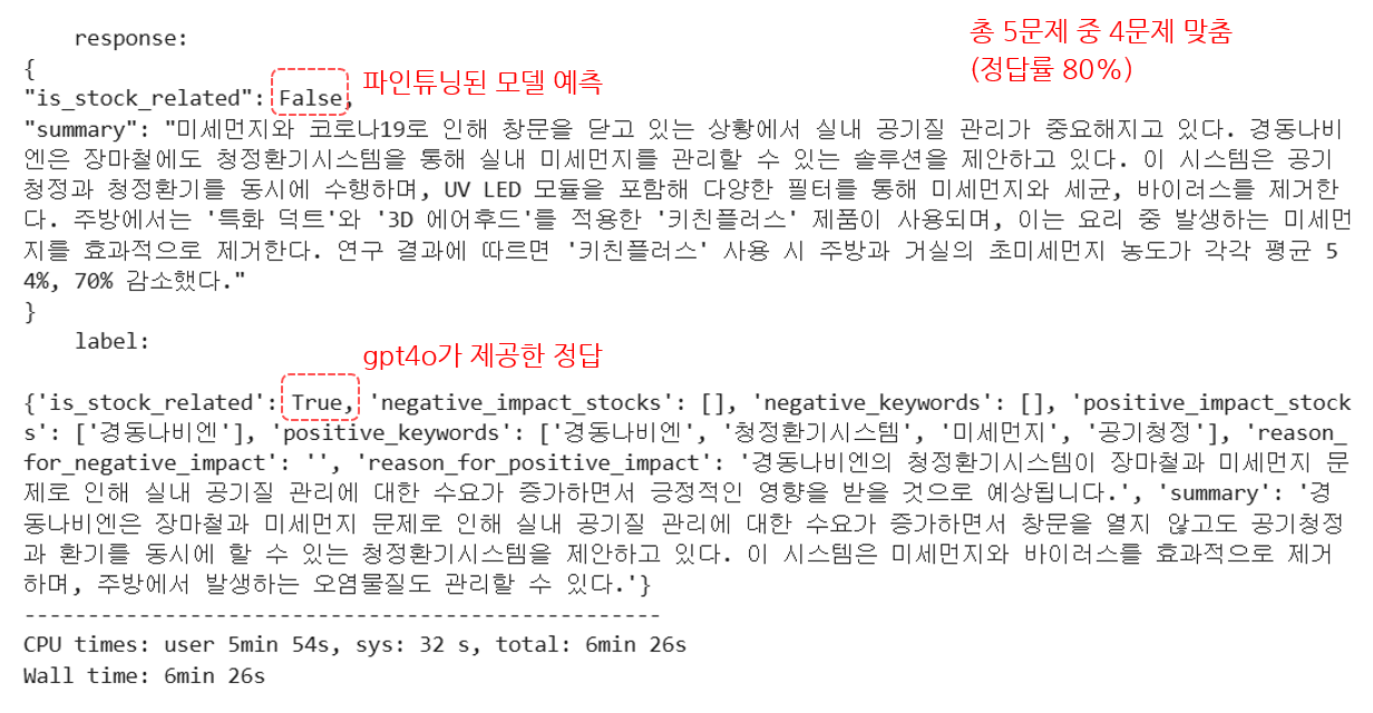 5문제 샘플 중 4개를 맞췄다(정답률 80%). 기본 모델의 정답률은 파인튜닝 모델의 100%보다 낮은 것을 알 수 있다.