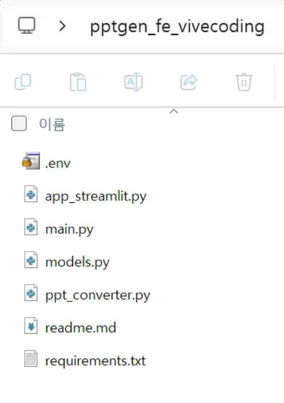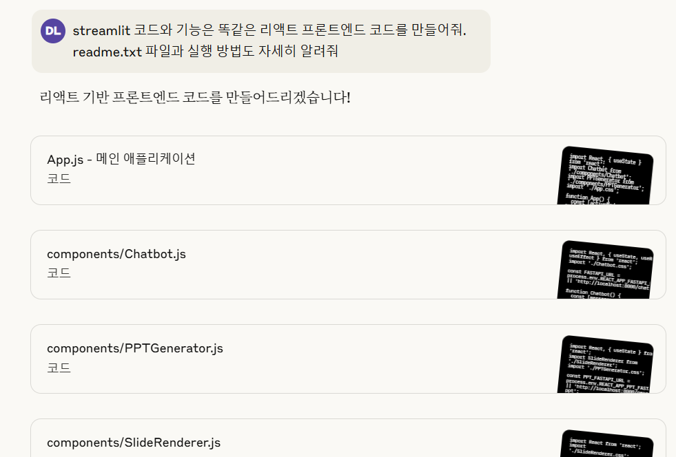 1. 상황 설명 : 기존에 fastapi + streamlit 으로 만들어둔 "PPT 생성기"가 있다. (fsl6) 이것을 클로드 바이브코딩을 이용해 리액트로 바꿔보려 한다.