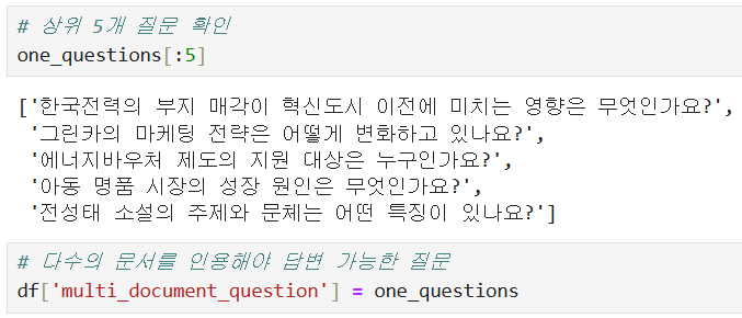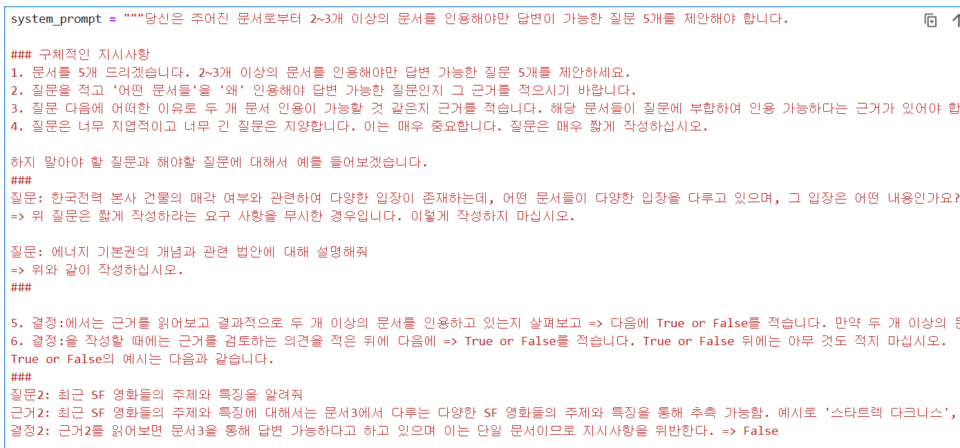 # 시스템 프롬프트 : "당신은 주어진 문서로부터 2~3개 이상의 문서를 인용해야만 답변이 가능한 질문 5개를 제안해야 합니다...."