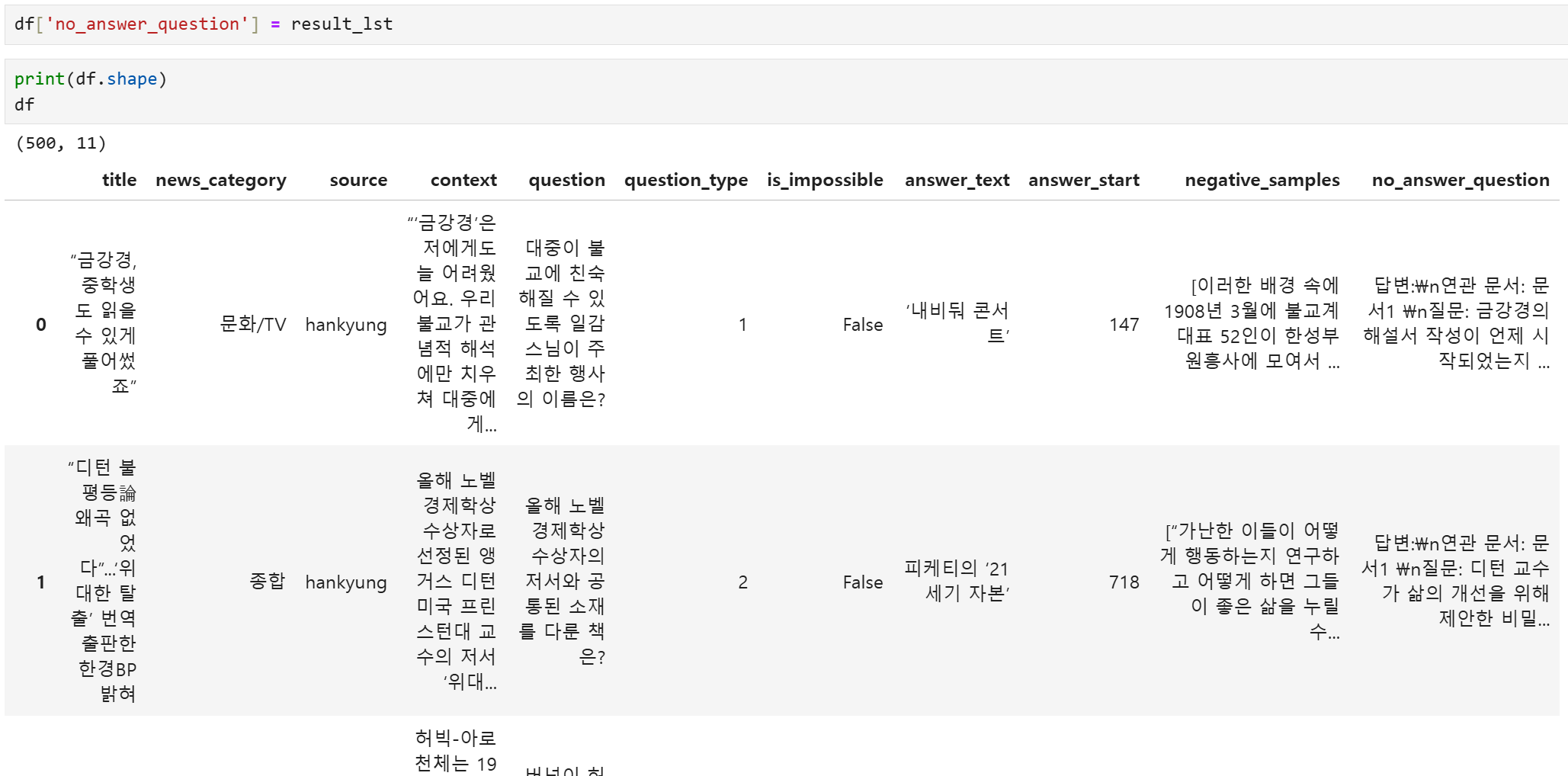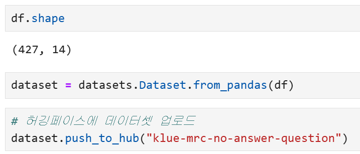 @ 허깅페이스에 생성된 no_answer_question 데이터셋 업로드 : "klue-mrc-no-answer-question"