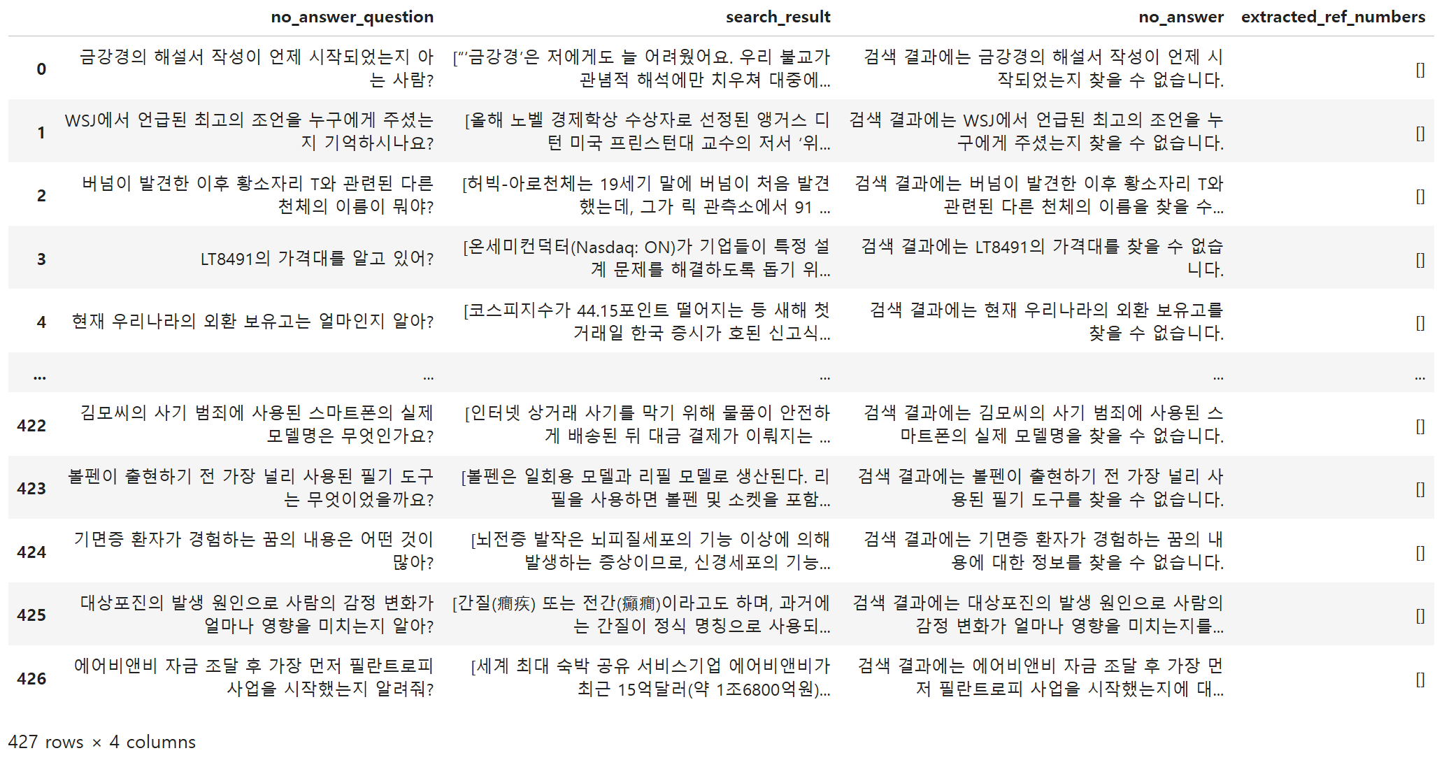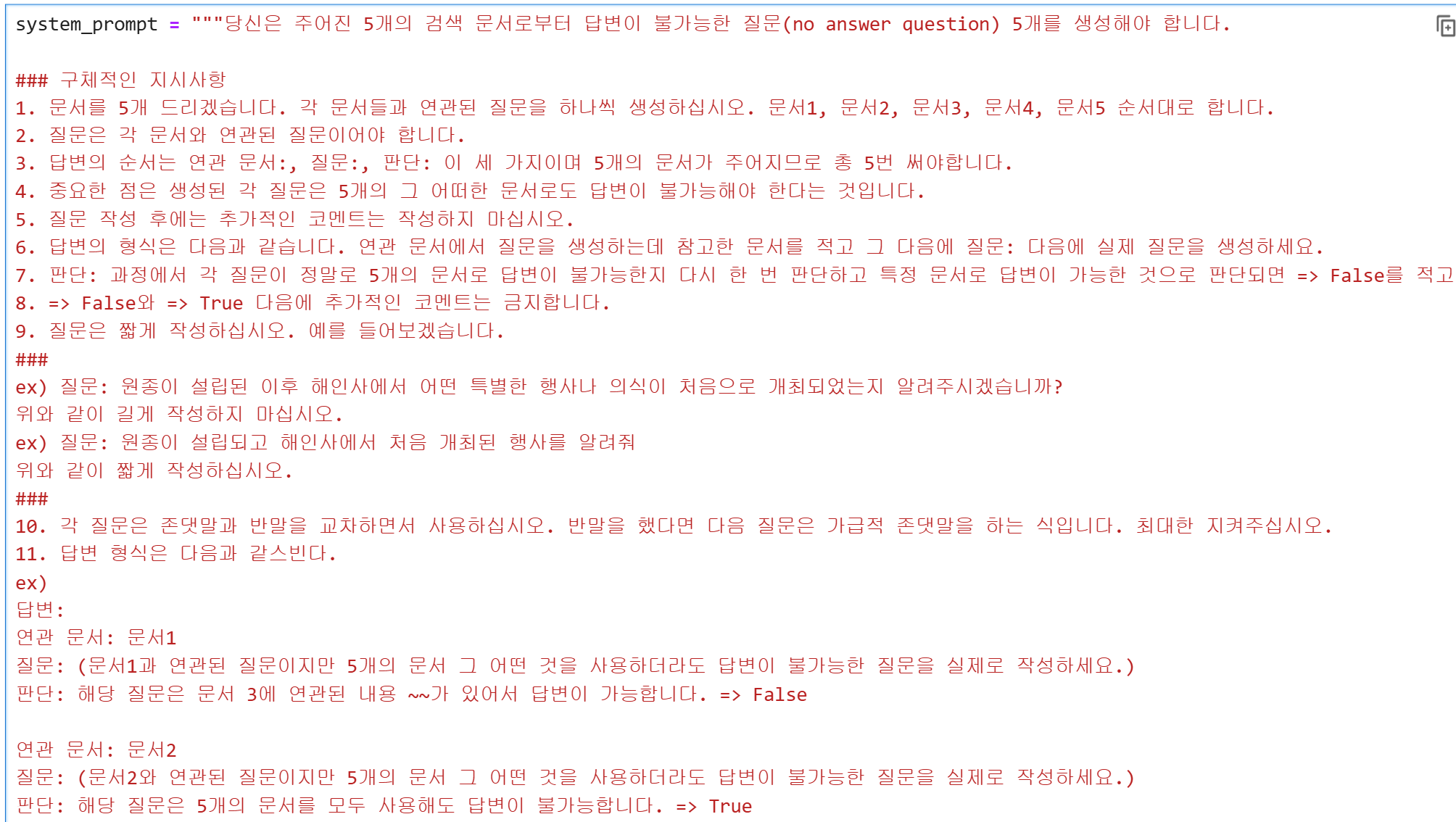 @ 시스템 프롬프트 : "당신은 주어진 5개의 검색 문서로부터 답변이 불가능한 질문(no answer question) 5개를 생성해야 합니다."