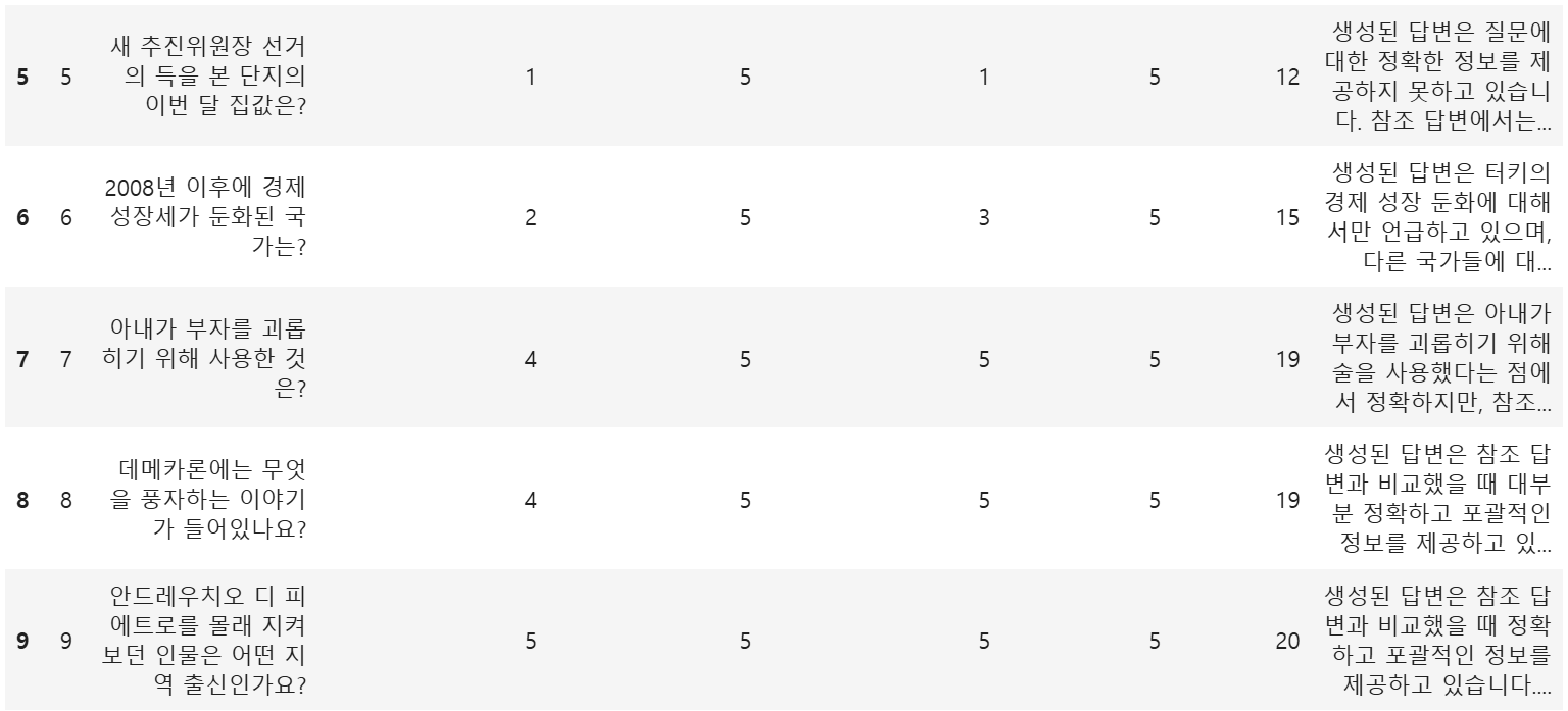 * 5점: 답변이 전적으로 컨텍스트에 있는 정보만을 사용함