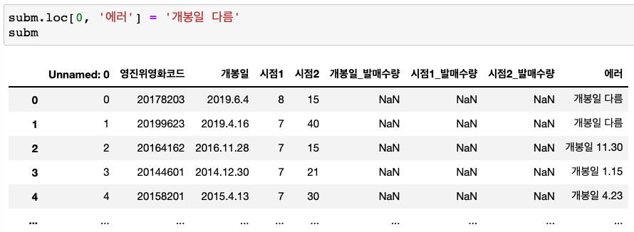 데이터프레임.loc[행, '컬럼명'] = 데이터