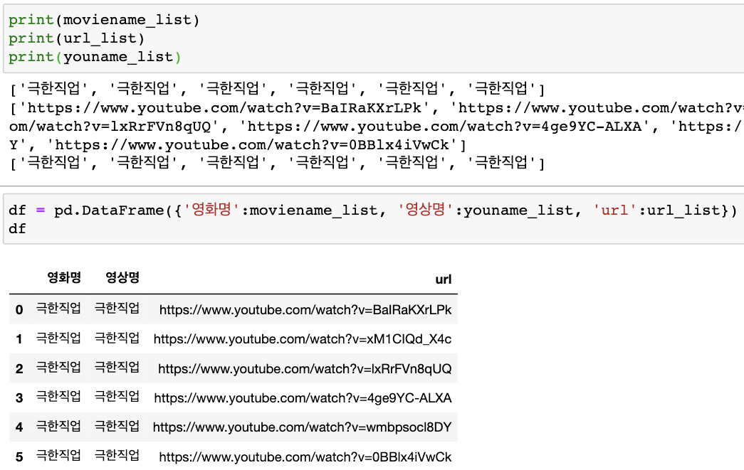 df = pd.DataFrame( {'영화명':moviename_list, '영상명':youname_list, 'url':url_list} )