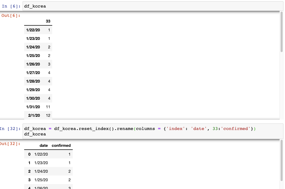 df_korea.reset_index().rename(columns = {'index': 'date', 33:'confirmed'})
